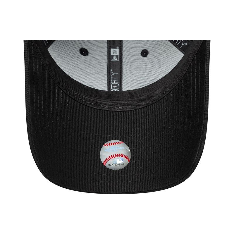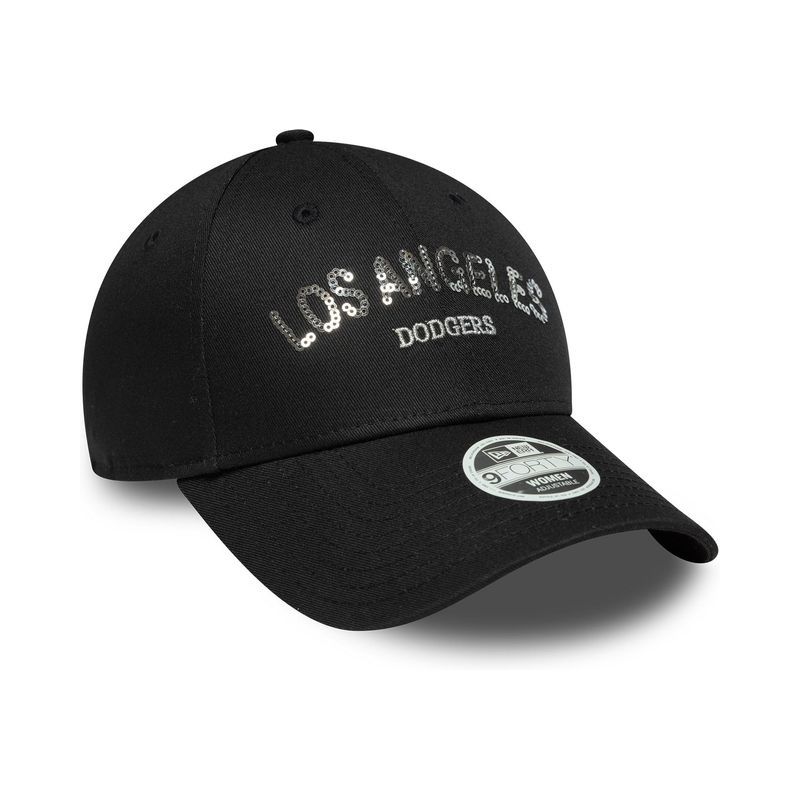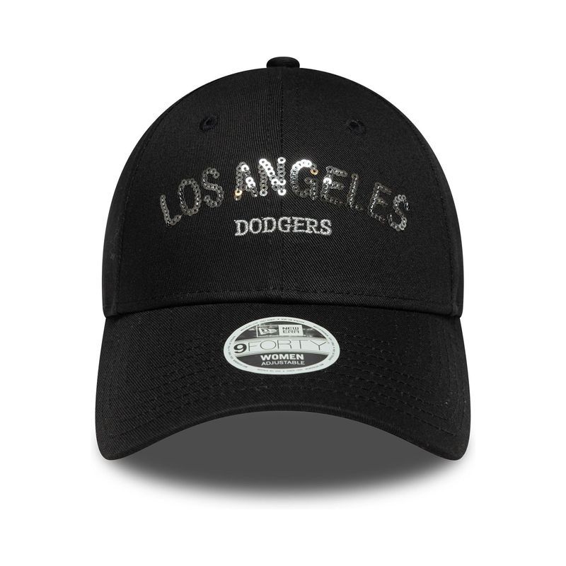 Womens MLB Sequin Wordmark LA Dodgers Black 9FORTY Adjustable Cap LA Dodgers wordmark in sequins on front LA Dodgers woven tab on rear New Era Flag embroidered on left Structured crown Strapback Curved visor 100% COTTON