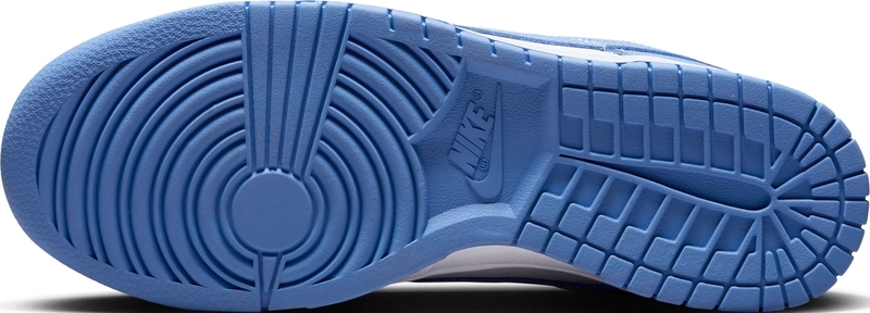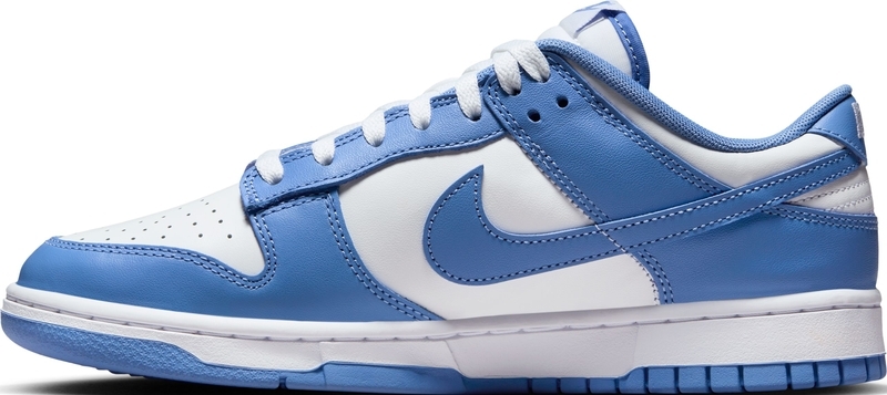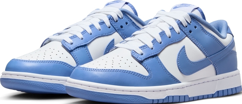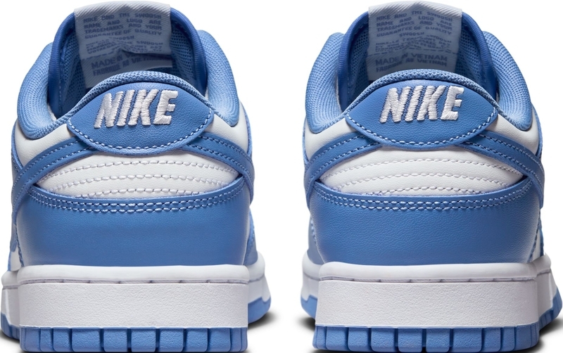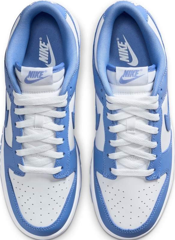 يتميز حذاء Nike Dunk Low "Polar Blue" بقاعدة بيضاء واضحة مع طبقات زرقاء فولاذية وشعار Swoosh مطابق للون. تتضمن التفاصيل التراثية ثقوبًا مسامية على صندوق أصابع القدم ولسانًا من النايلون المسامي، ومغطاة بعلامة Nike المنسوجة. تظهر علامة Nike التجارية الإضافية على اللسان الخلفي وبطانة الجورب. يعكس جذور الحذاء في الثمانينيات نعل مطاطي متين، مزود ببطانة داخلية من البولي يوريثين لتبطين خفيف الوزن.