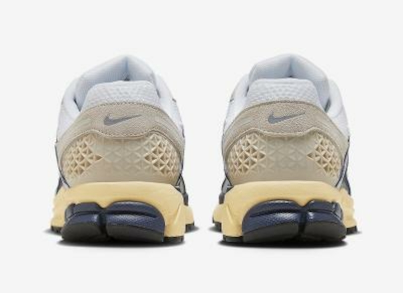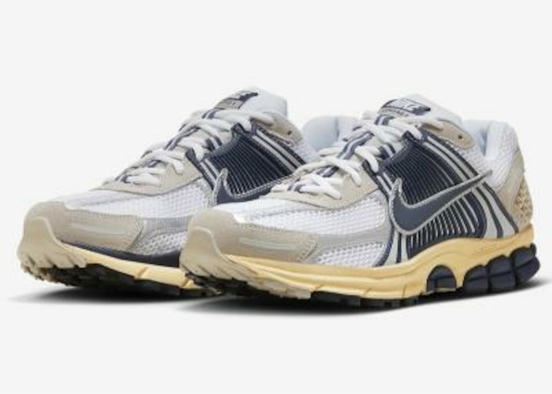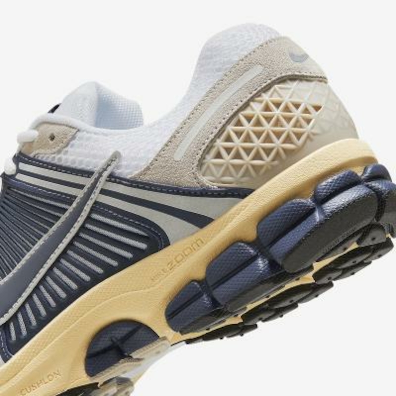 حذاء Nike Zoom Vomero 5 يتميز بالألوان الأبيض والأزرق والكريمي. يمزج تصميمه بين شبكة مسامية وجلد سويدي، ويبرزه قفص الأربطة البلاستيكي الشهير المصنوع من مادة TPU . تشمل اللمسات الجديرة بالملاحظة عناصر عاكسة 3M ونقش "منذ 72" الذي يزين النعال، مما يمثل إشارة إلى عام تأسيس Nike.