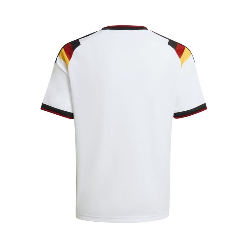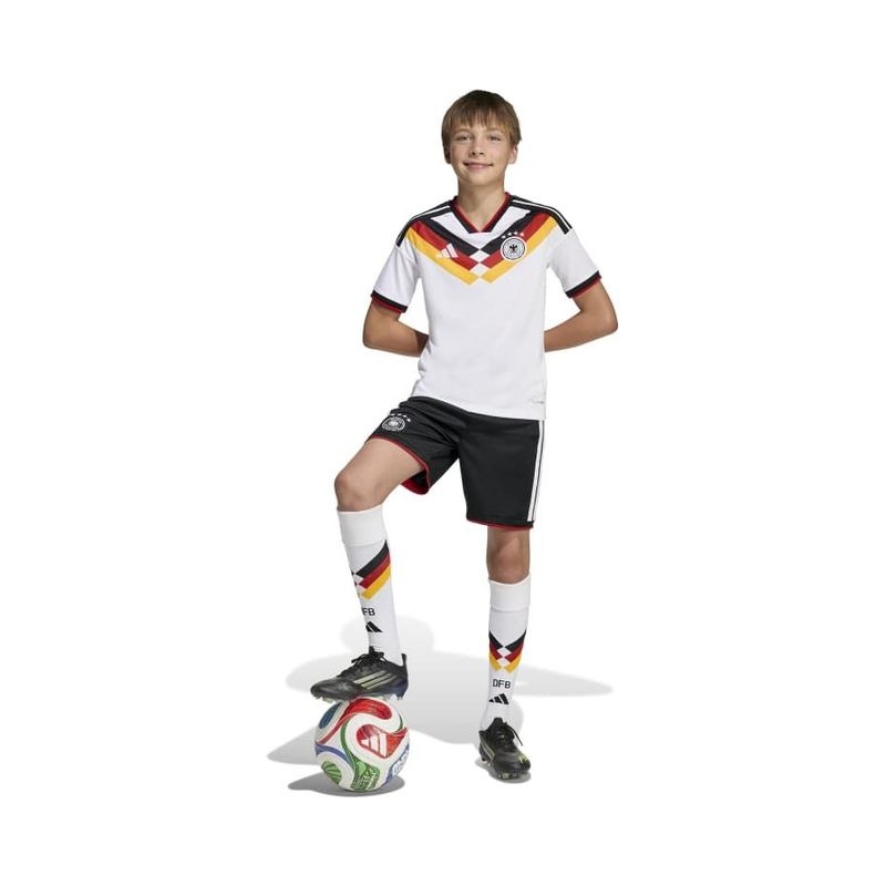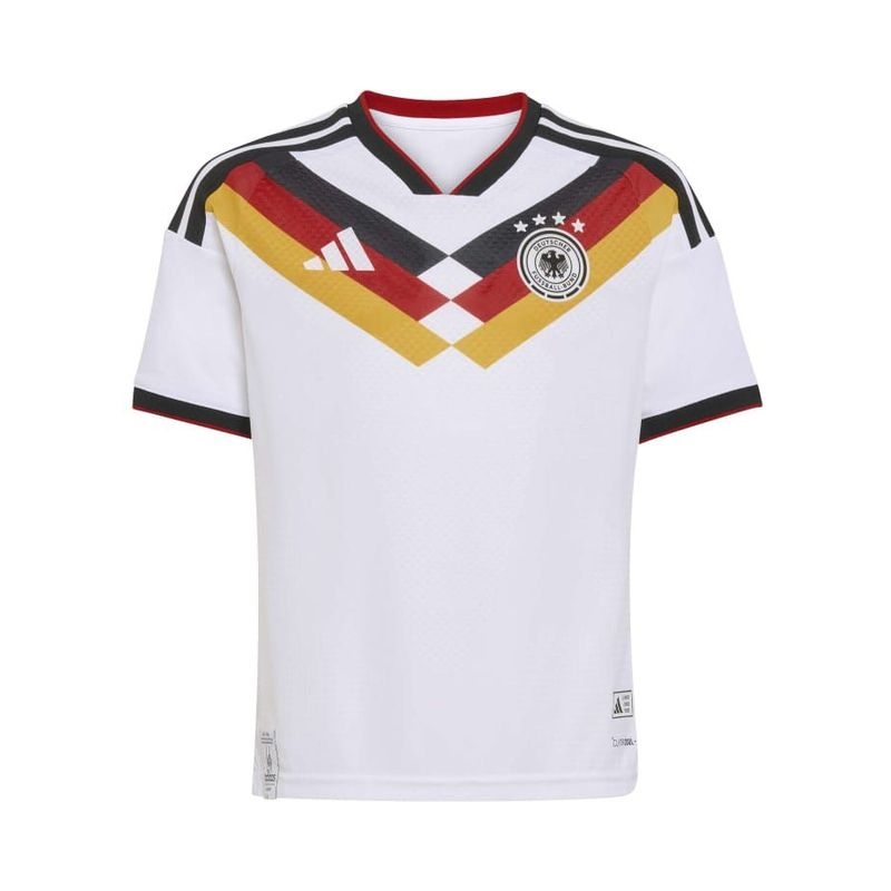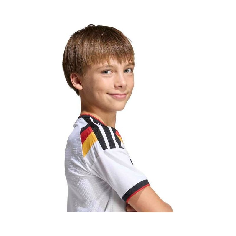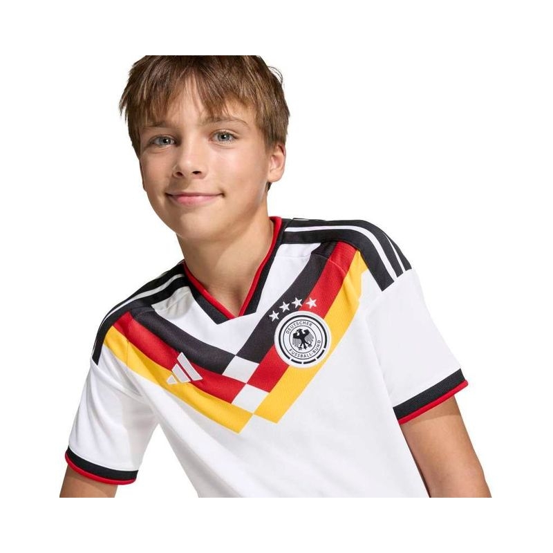 The Germany 26 Home Jersey is designed for young football enthusiasts who dream of emulating their heroes on the pitch. This jersey combines the essence of iconic moments with cutting-edge tech so they can stand out in both style and performance. Integrated Climacool fabric technology wicks and disperses sweat for a cool, dry and distraction-free performance while a regular fit offers freedom of movement, so they can feel focused and ready during intense matches. The jersey's doubleknit construction meanwhile offers durability and a soft feel against the skin, making the top a great choice for everyday wear. And with the adidas logo and club crest proudly displayed, your child will feel like part of the team. Let your child experience the thrill of the game with this jersey, where tradition and heritage meets innovation. It’s more than just clothing. It’s a way of life.