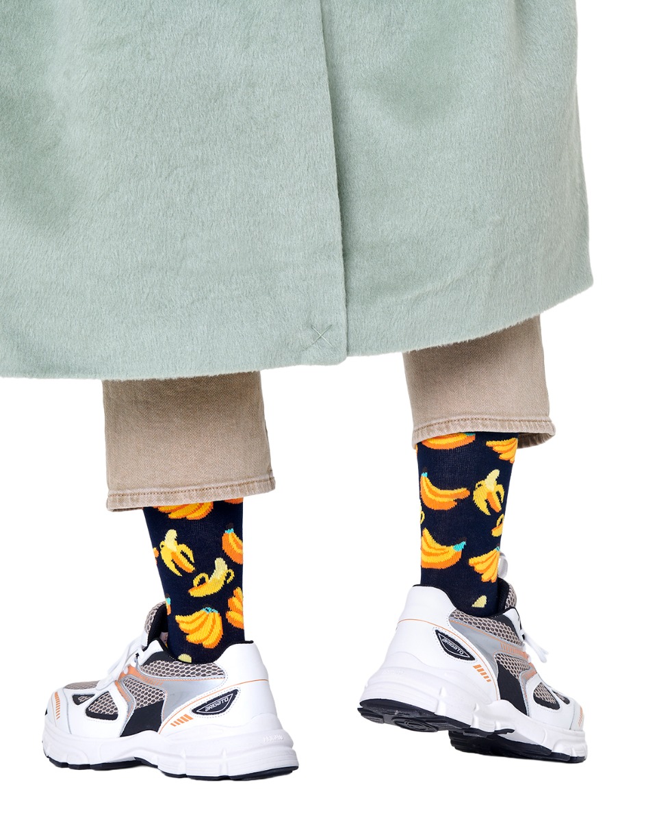 Who can say no to a pair of Banana socks? The half moon-like curves can be enjoyed on their own or mis-matched with other fruit socks for a fruit salad style. So have a perfect banana print snack straight out of your sock drawer! Made of soft and breathable organic combed cotton, available in matching print for kids. Vibrant banana shapes in a playful arrangement create a lively visual effect on the Banana Sock. The bold, curved design elements in bright hues add a dynamic touch to any outfit, making these colorful socks a great way to express your personality. With their fun and carefree vibe, they're perfect for dressing up or dressing down – and can easily be paired with other bold patterns for a look that's uniquely yours. The banana print design is sure to bring a smile to anyone's face.