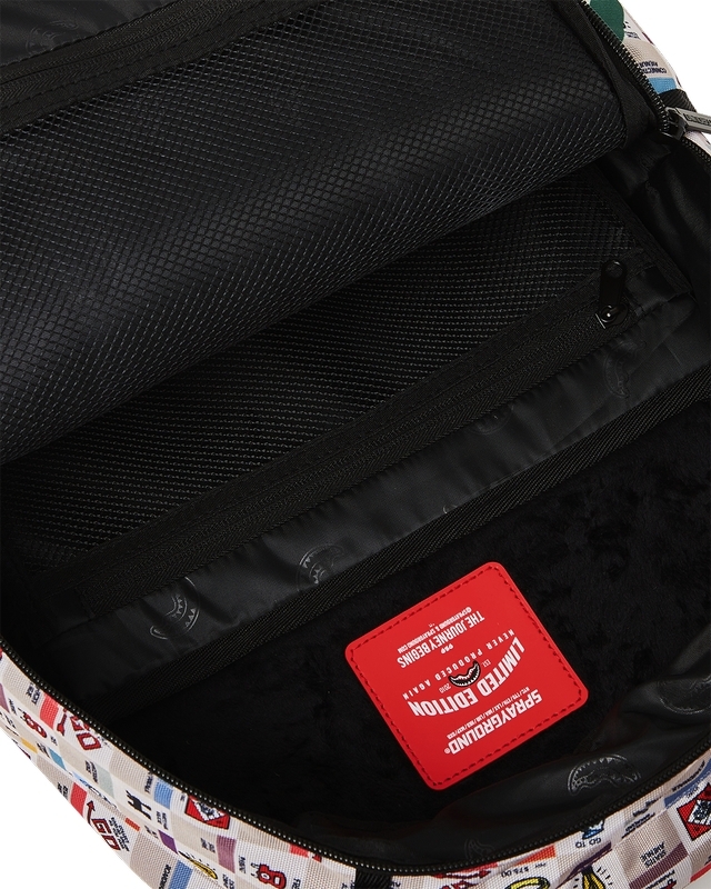 Dimensions: 18' x 6' x 11.5' • Front zipper pocket • Side pockets • Zippered Stash pocket • Separate velour sunglass compartment • Ergonomic mesh back padding • Adjustable Straps for custom sizing • Gold zippers with metal hardware • Metal 'Sprayground Authentic' badge • Slide through back sleeve connects to carry-on luggage to free your hands