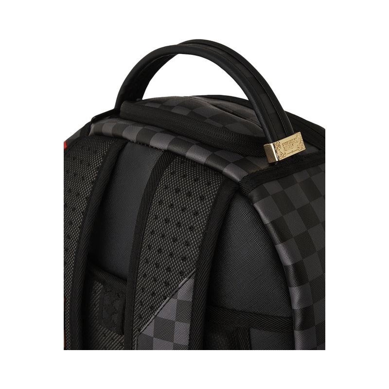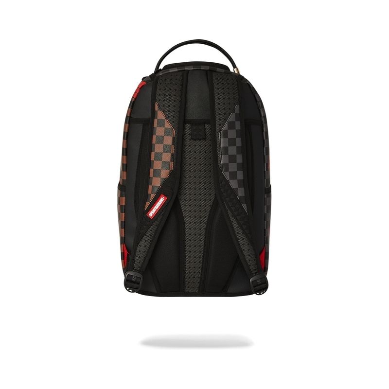 DLXV = 100% FAUX LEATHER PRODUCT DETAILS Exterior Dimensions: 18' x 6' x 11.5' • Front zipper pocket • Side pockets • Zippered Stash pocket • Separate velour sunglass compartment • Ergonomic mesh back padding • Adjustable Straps for custom sizing • Gold zippers with metal hardware • Metal 'Sprayground Authentic' badge • Slide through back sleeve connects to carry-on luggage to free your hands Interior Separate velour laptop compartment • Mesh organizer pocket   Fabric Durable Faux Leather water-resistant fabric