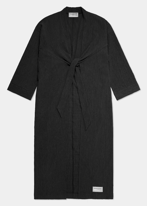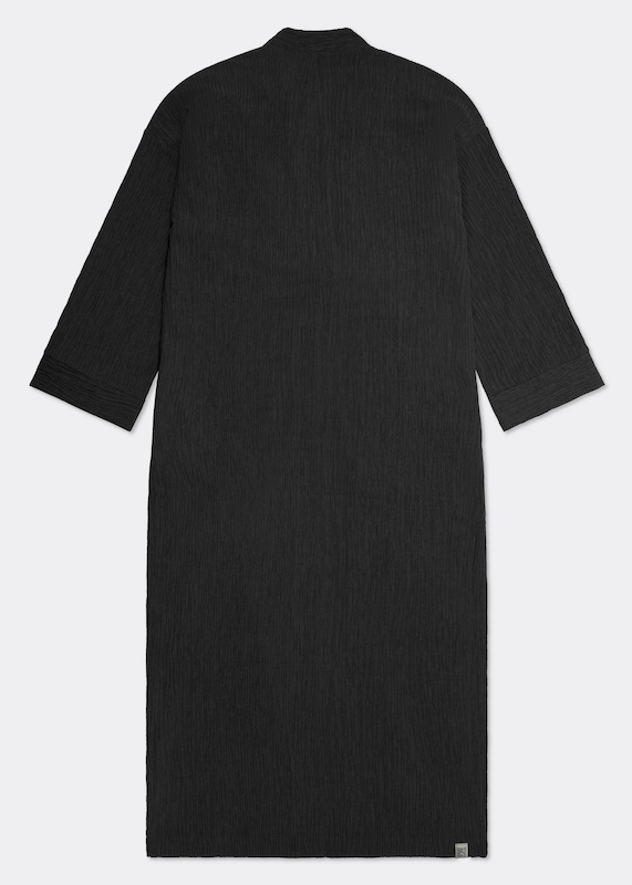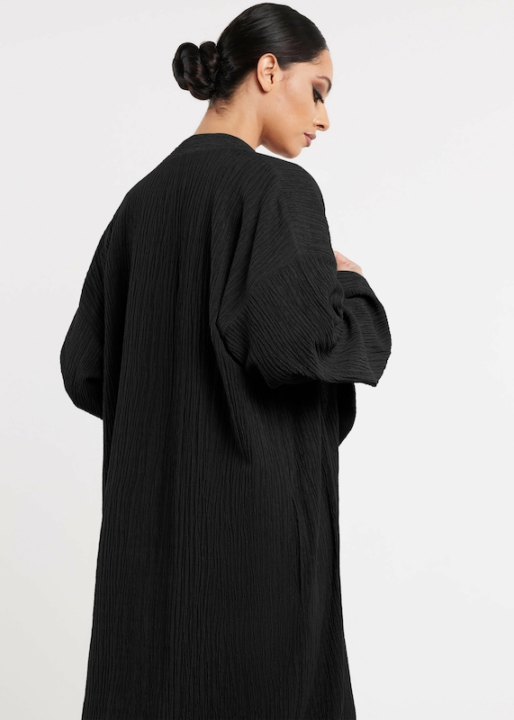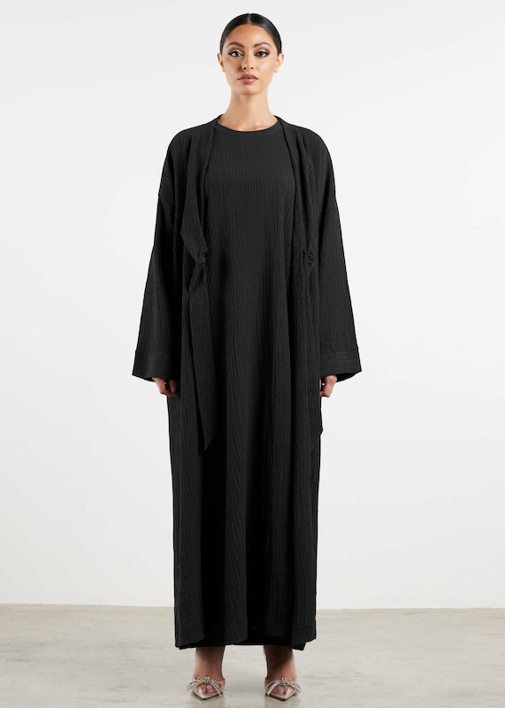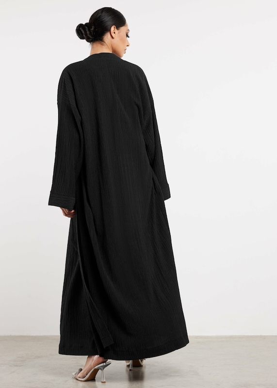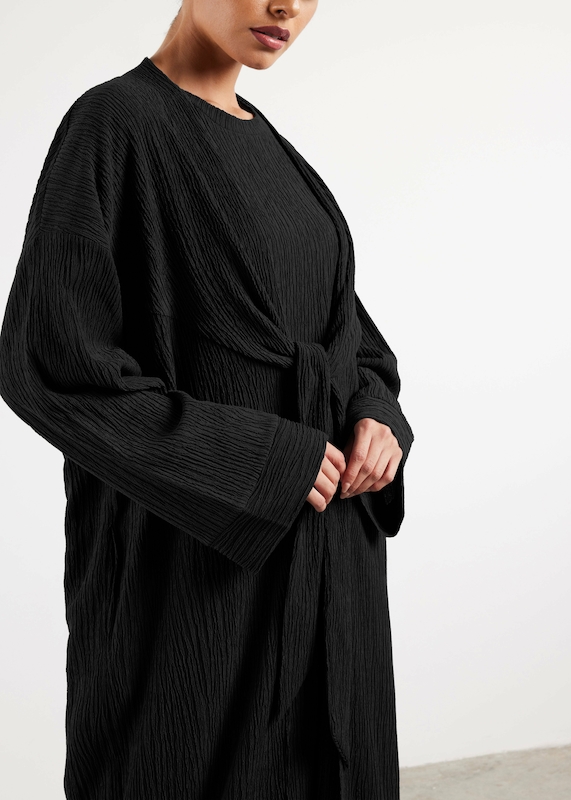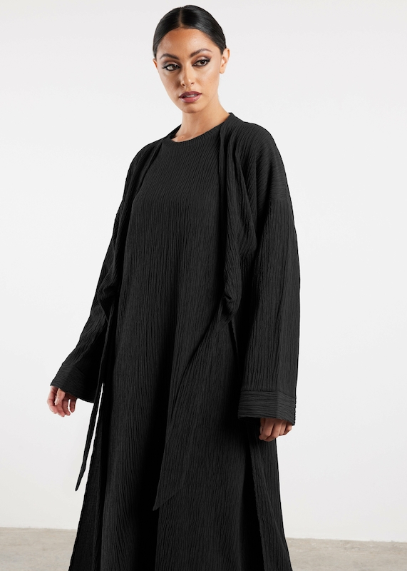 A modern take on the classic abaya, this piece is designed with the newly innovated crinked fabric. Its simple lines features long sleeves, a long hem, wide sleeves and a delicate knot closure at the centre with draped fabric.
